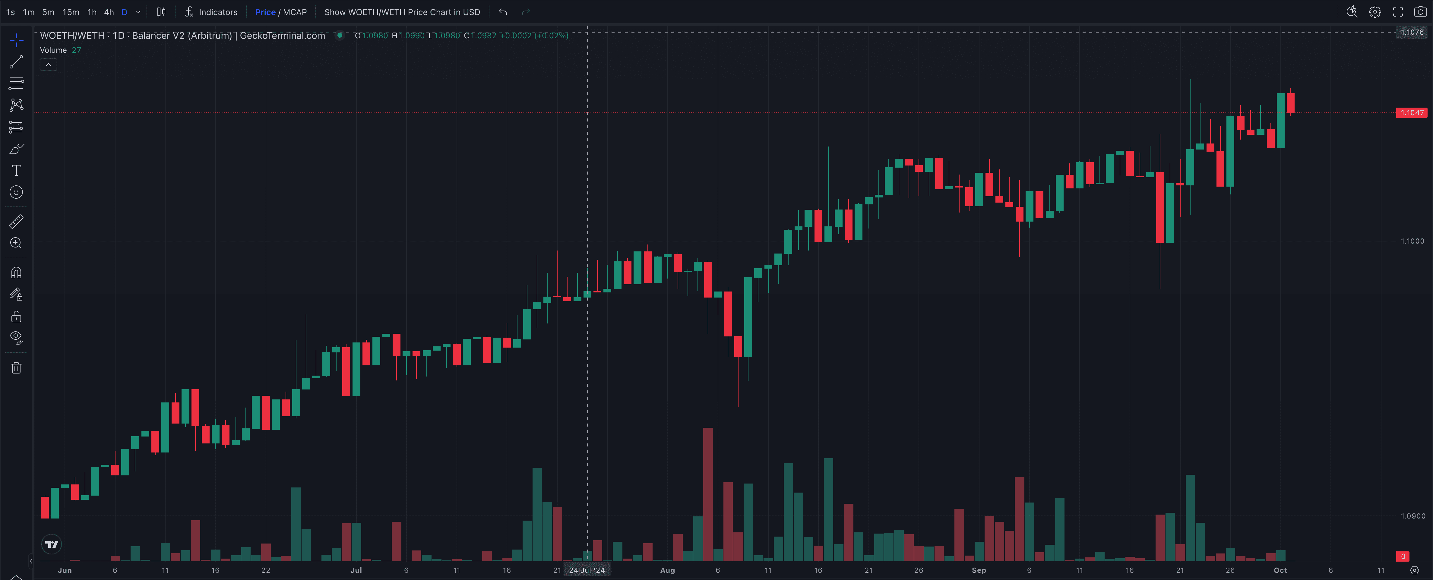 Analysis of WOETH’s performance reveals two relatively minor de-pegging events, with maximum deviations occurring on August 8th, 2024, and September 19th, 2024. Each event resulted in an estimated -0.5% depeg, which was swiftly corrected in the subsequent days.