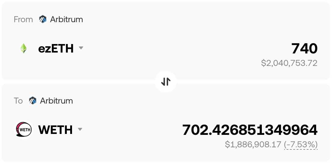 On Arbitrum, the liquidity available within a 7.5% price impact amounts to 740 ezETH or $2.04m. Applying the normal methodology yields a recommended supply cap of 1500 ezETH and a borrow cap of 150 ezETH. We found the following main liquidity venues: