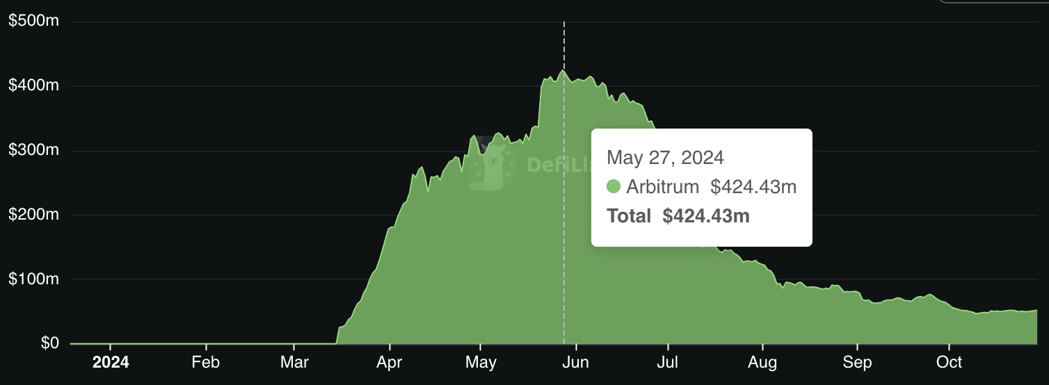 We can see that ezETH TVL on Arbitrum peaked at around $425m on May 27th, 2024, before returning to a plateau at around $50m. This coincides with the overall TVL trend for ezETH and can be explained by the negative sentiment from the community on the TGE event, together with the lack of withdrawals, which resulted in a strong downside depeg at the end of April 2024, which led to reduced confidence in the asset.