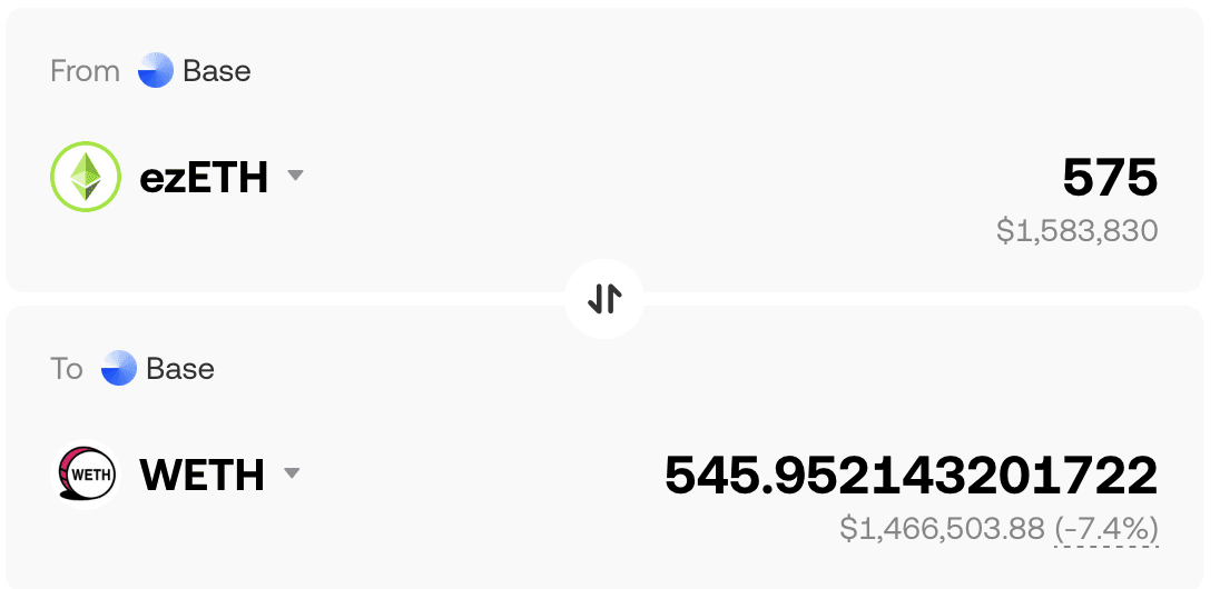On Base, the liquidity available within a 7.5% price impact amounts to 575 ezETH or $1.58m. Applying the normal methodology yields a recommended supply cap of 1100 ezETH and a borrow cap of 110 ezETH. We found the following liquidity venues: