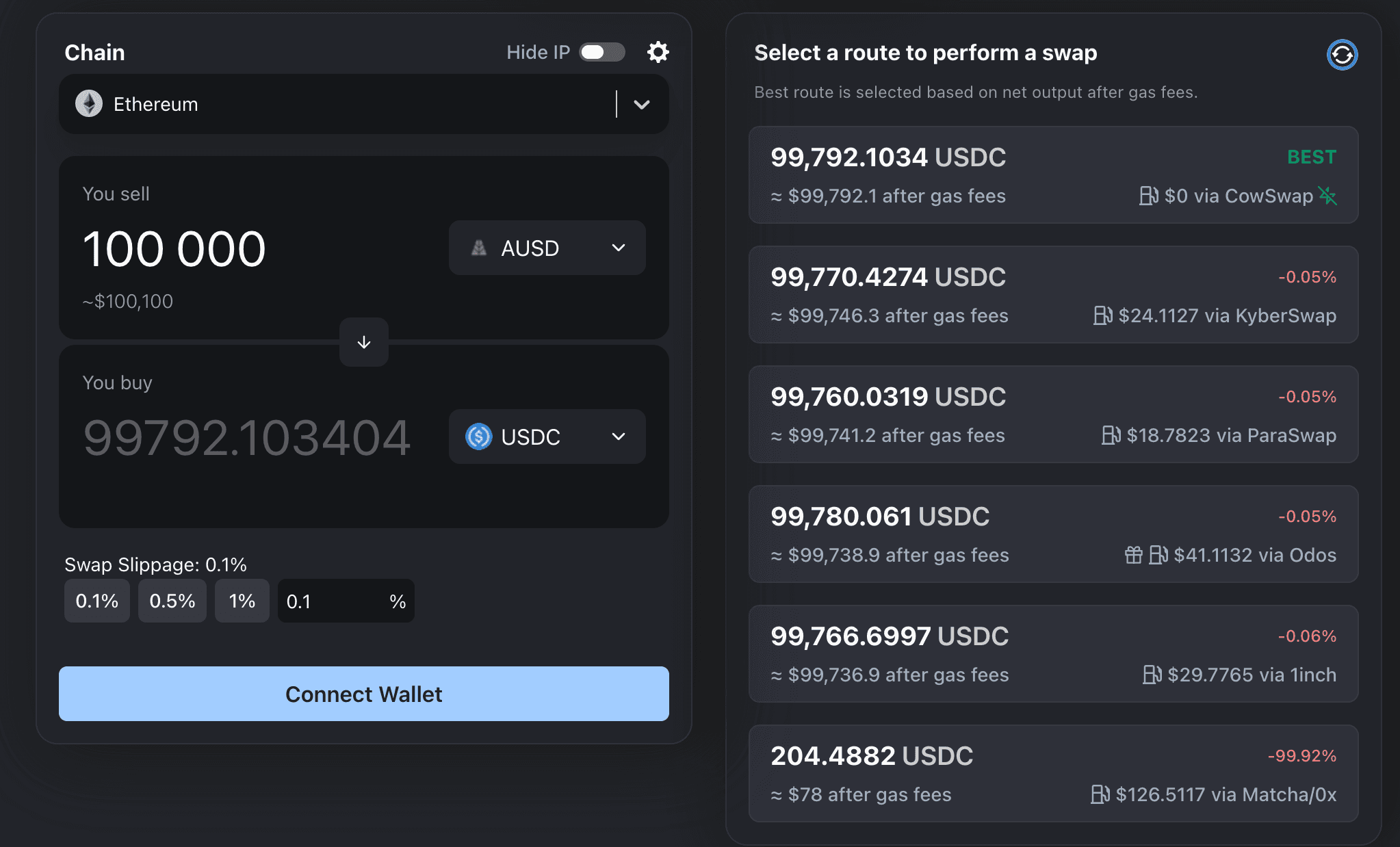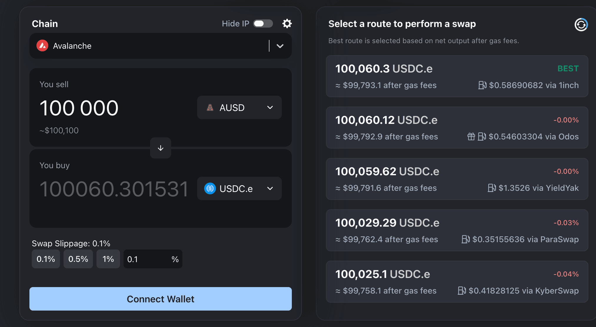 The slippage on Avalanche is minimal (below 0.1%) after fees for a swap of 100,000 AUSD. The slippage for the trade of the same amount on Ethereum is slightly higher (approx. 0.21%), likely due to higher gas fees and potentially more dispersed liquidity across platforms.