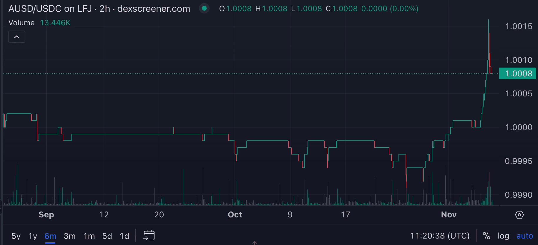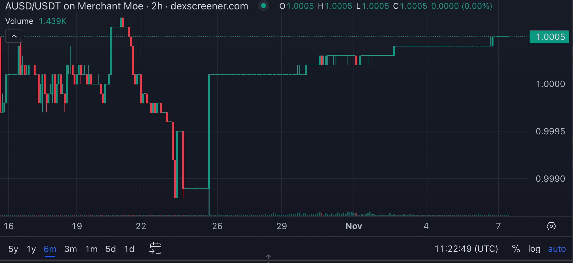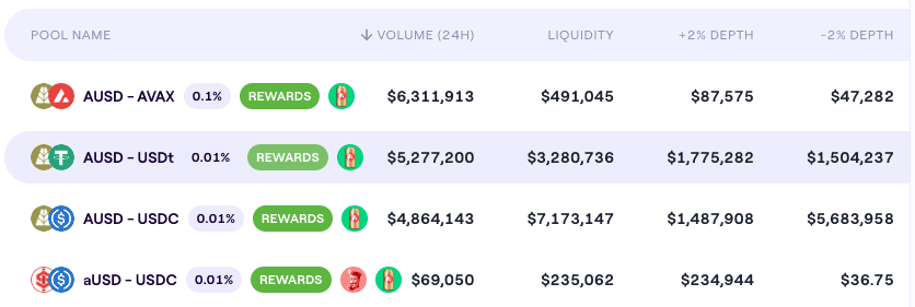 The AUSD/USDC pair on LFJ (where the most liquidity is concentrated on Avalanche) shows a generally stable trading range close to the $1 peg with minor deviations.