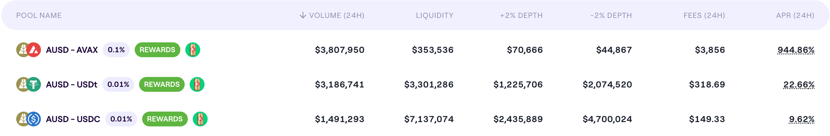 While liquidity on Avalanche is satisfactory, primarily in liquidity pools on LFJ (Trader Joe) DEX paired with USDT and USDC, current volumes may be inflated by temporary AVAX incentives from the ongoing BOOST program. This will require continued monitoring. AUSD is not suitable for use as collateral. The main foreseen use case is borrowing to farm LP incentives, and excessive leveraged looping for this purpose should be prevented.