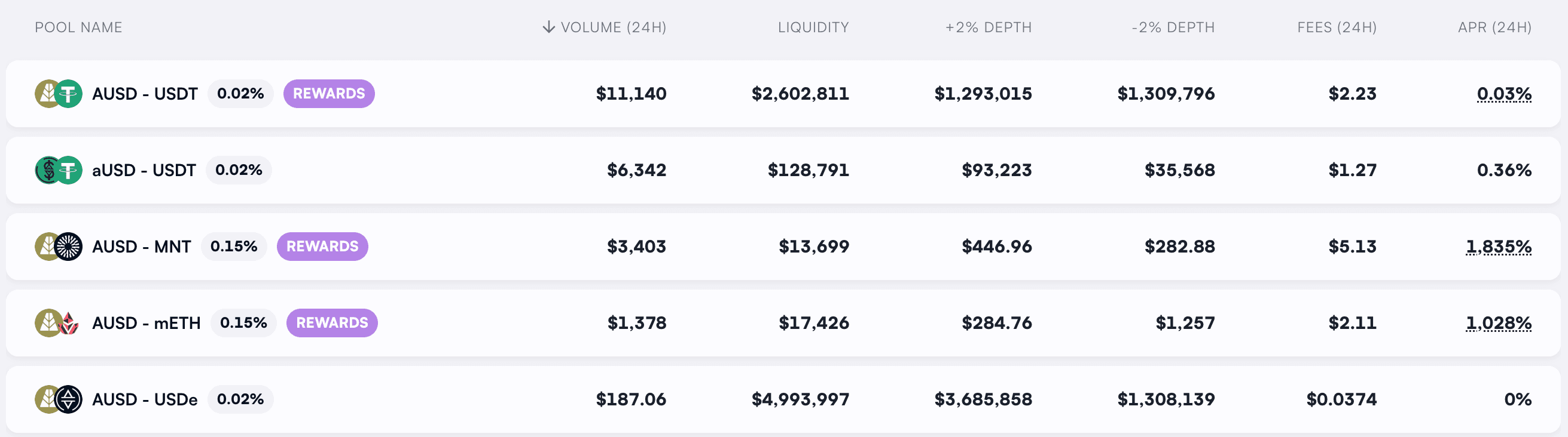 The total volume for AUSD over the 30 days is close to $68M. This cumulative value indicates the combined mainnet liquidity of AUSD across Curve, Uniswap V2, and Balancer.