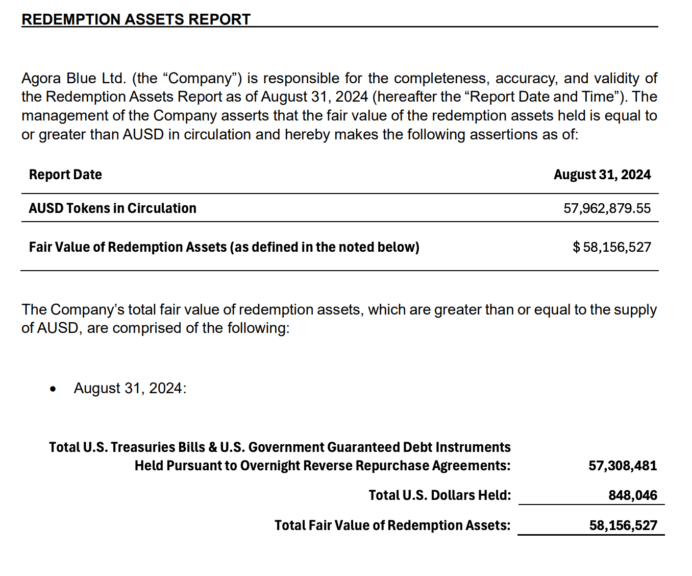 Redemption Assets Reports dated July 2024 and August 2024 assert that the fair value of redemption assets is equal to or greater than AUSD in circulation. The attestations are unaudited and prepared by one of the Agora entities (Agora Blue Ltd).