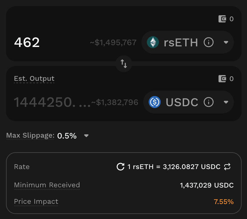 rsETH has meaningful liquidity on Arbitrum, with 462 rsETH ($1.49m) available to be sold at a 7.5% price impact.