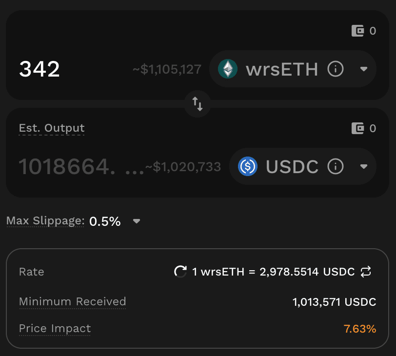 Base has less liquidity than Arbitrum, with only 342 rsETH ($1.02m) available within a 7.5% price impact.