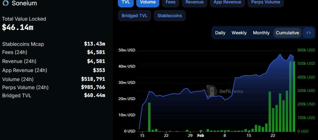 Source: Soneium TVL, DeFiLlama, February 28, 2025.