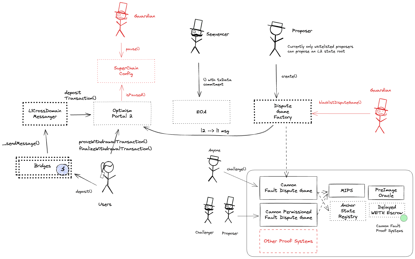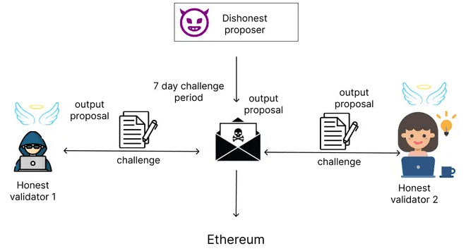 All proposals are subject to a 1-week window, during which anyone with the op-challenger tool can participate. In addition, the Optimism Security Council holds the Guardian role as a final backstop in case of a failure of the fault-proof game (bonded).