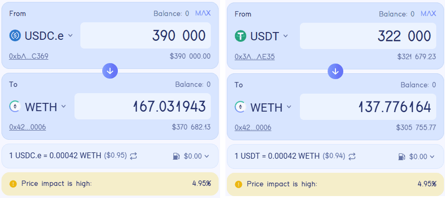 Source: USDC.e & USDT swap against WETH with <5% slippage, Wowmax, March 1st, 2025.