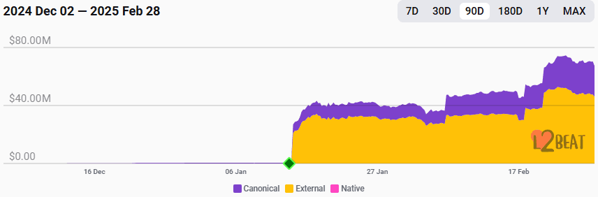 The total Value Secured on Soneium as of February 28, 2025, amounted to $67.37 M. The majority of assets were externally bridged ($45.93M in ASTR, SolvBTC, YAYSTONE, YAYAGETH, wstETH, WBTC, and USDC) and the remainder were bridged canonically ($21.44M in USDT and WETH). Since the mainnet launch on January 14, TVS has steadily grown. Soneium does not have a native token at the time of writing.