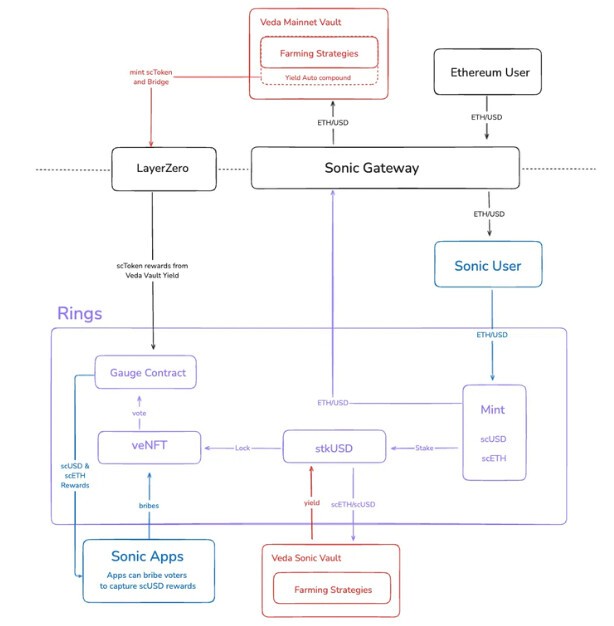 scToken architecture is built on the Veda BoringVault contracts, with Rings deploying vaults on Ethereum and Sonic. All assets deposited into Rings go into BoringVaults, scUSD, scETH, and scBTC represent ERC-20 vault receipt tokens for their respective vault contracts. The architecture involves cross-chain components: the native Sonic bridge bridges the underlying capital between chains. In contrast, LayerZero bridges the vault shares for the corresponding vaults.