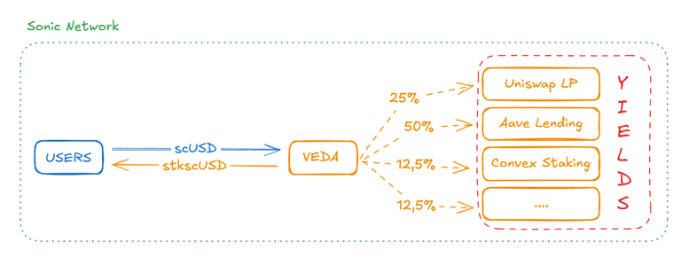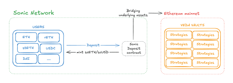 Assets can be deposited on Ethereum or Sonic. Assets from Sonic are bridged to Ethereum mainnet while scToken minting occurs on Sonic and Ethereum. Underlying assets are deposited into ETH Veda BoringVaults and then allocated to whitelisted strategies currently curated by Veda, Paladin, and Tholgar.