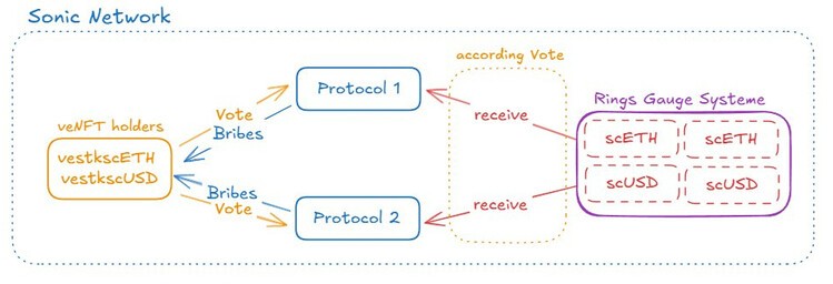 Rings’ iteration of the ve(3,3) model only uses a simplified gauge system and delegation of voting power from the Thena codebase. Vault yields are used to mint for scETH, scUSD, and scBTC and sent to the gauge system contract. Holders of staked scToken can lock their assets for veNFT to participate in gauge voting (voting weight is equivalent to the duration of their lock). In return, veNFT holders receive bribes/vote incentives in exchange for their votes. Holders of veNFTs forfeit the yield from staked scAssets.
