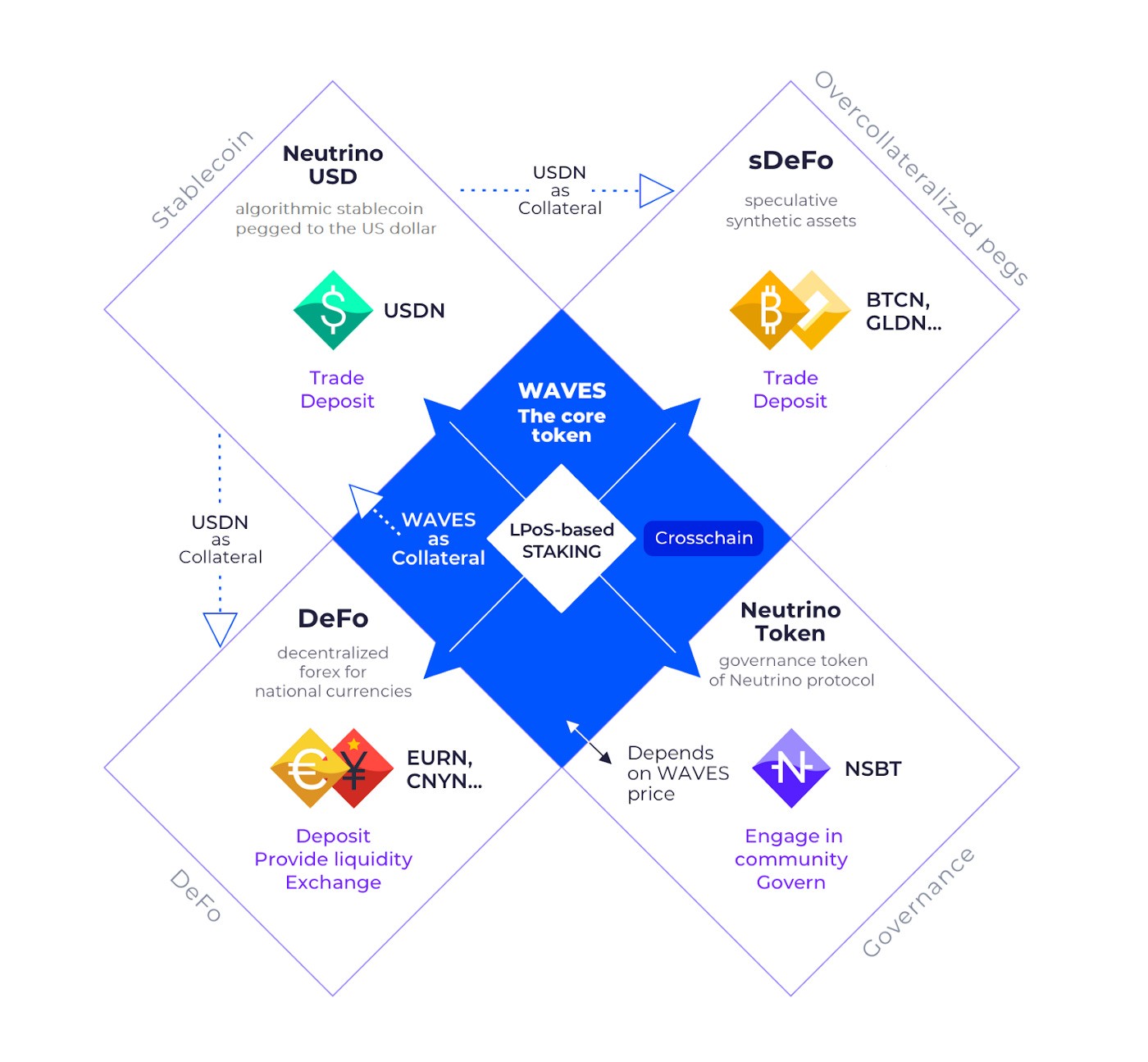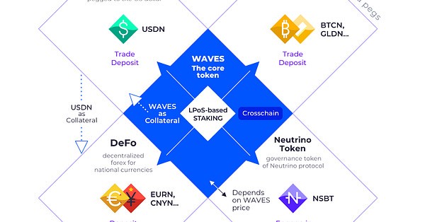 The Neutrino system consists of 4 tokens: WAVES, USDN, NSBT, and SURF. WAVES is the native coin of the Waves blockchain, used for paying transaction fees and as collateral for USDN.