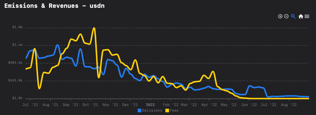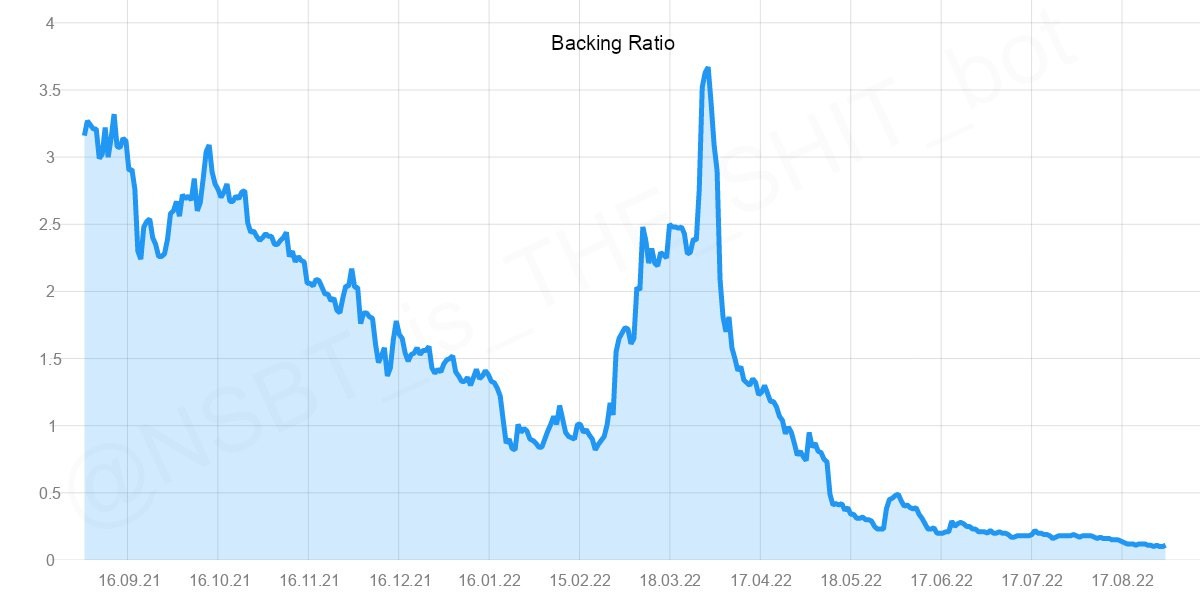 Neutrino’s USDN should be 100% collateralized by WAVES. Still, its backing ratio has dropped to 10% following multiple depegs, the liquidity crunch on Vires Finance, and a struggling WAVES price (from over 60$ in April to below 5$ now).