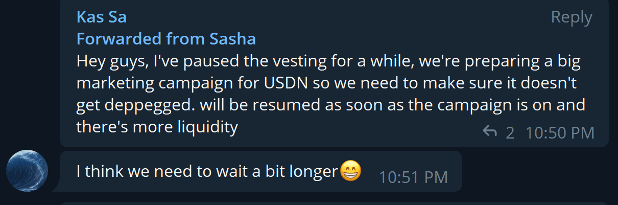 However, less than a month later, on August 26th, Sasha Ivanov announced on Telegram that he would suspend vesting for USDN to prevent its depeg (there was no governance vote or any public announcement):