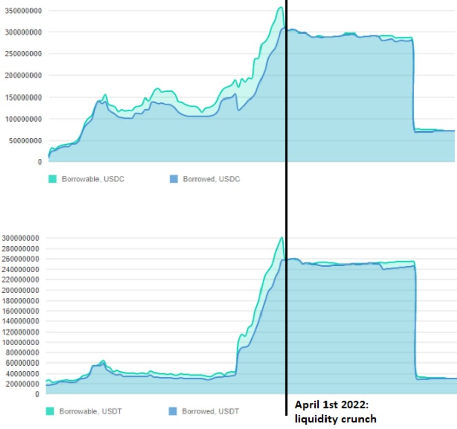 Following these allegations, some lenders withdrew all of their liquidity from the USDC and USDT markets. Yet, as the following graphs show, borrowers were still able to take out loans for over 300M in USDC, and USDT before lenders stopped providing capital.