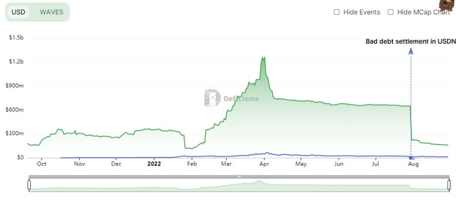 In April 2022, a USDN depeg led to Vires Finance accruing USD 500M in bad debt.