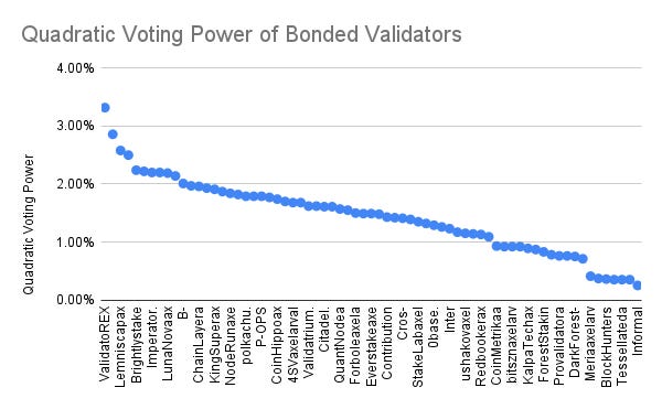 If we look at the distribution of bonded validators at the time of the analysis, we can see that the total stake ranges from 64,000 AXL tokens to 45.7 million AXL tokens. The voting power of a validator ranges from .01% to 6.43%, while the quadratic voting power ranges from .12% to 3.32%. The total delegation of validators ranges from 4 to 1,492.