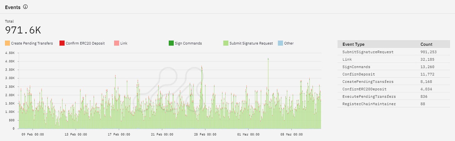 The SubmitSignatureRequest event type is the most frequent, occurring close to 1 million times. The Link event type occurred 32,185 times, while SignCommands occurred 13,260 times, suggesting that a significant number of users are linking their Axelar addresses with EVM addresses and signing commands to initiate cross-chain transfers. The ConfirmERC20Deposit and ExecutePendingTransfers event types occurred less frequently. Finally, the RegisterChainMaintainer event type occurred only 109 times.