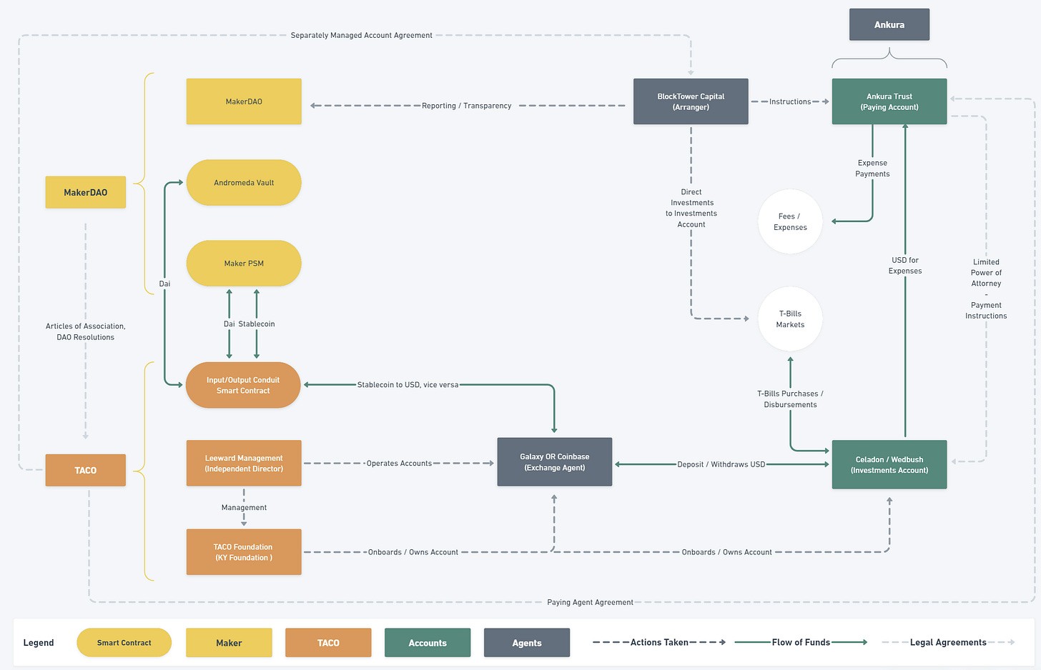 BlockTower directs how the money is invested based on instructions from TACO. Ankura Trust acts as the Paying Agent to handle the flow of funds and funds settlement on behalf of TACO. Wedbush acts as the custodian that keeps the Treasuries purchases in a separate account for TACO.