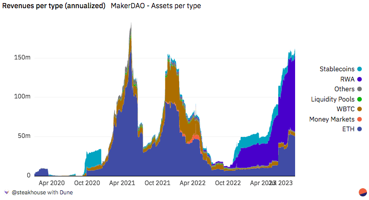 MakerDAO’s real-world asset (RWA) holdings generate the lion’s share of the protocol revenues, which in September 2023 amounts to over 90m/year annualized. The increase in RWA-generated revenue in late 2022 has put MakerDAO in an excellent position to increase its saving rate.