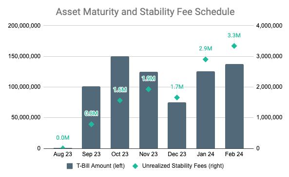 DAI is swapped into USDC using Maker’s PSM. Exchanges like Coinbase and Galaxy Digital facilitate exchange from USDC into USD to buy the Treasuries. The Treasuries purchased have maturities between 0-6 months. As they mature, the interest earned is sent back to MakerDAO. As of July the vault became active and has since expanded to a DAI supply of 852,450,000 out of a 1.28B DAI ceiling over the course of several months.