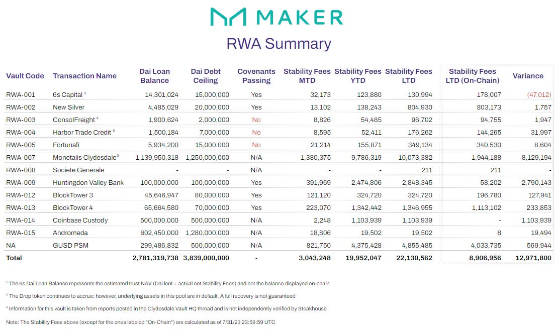 Steakhouse also publishes monthly Real-World Asset Reports, the most recent of which was published in August. As of the most recent report covering July 2023, there were 13 active RWA vaults with a total DAI loan balance of 2.78B DAI and a debt ceiling of 3.83B DAI. Underlying assets in two vaults were in default (RWA-003 and RWA-004) and another (RWA-005) was recently approved for offboarding.