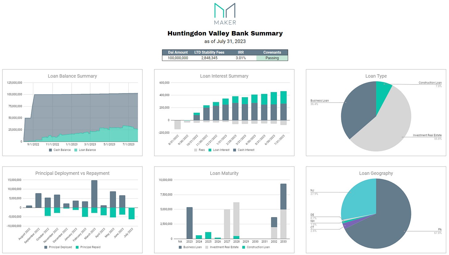HVB loans are commercial credits offered by the Pennsylvania-based Huntingdon Valley Bank held by HV Bancorp. Inc. (HVB). These loans have terms mostly between 3-5 years and span various categories, including commercial real estate, construction, and business loans. Interest rates vary, either being fixed or floating. A unique 10-point internal risk system is used by HVB to grade these loans, requiring a minimum “Pass” rating for Maker participation. These loans, which showcase a diverse geographic distribution primarily in the Mid-Atlantic states, are integrated into a bankruptcy-protected trust structure. HVB retains at least half exposure in each loan, ensuring aligned interests, and assumes the role of a loan servicer.