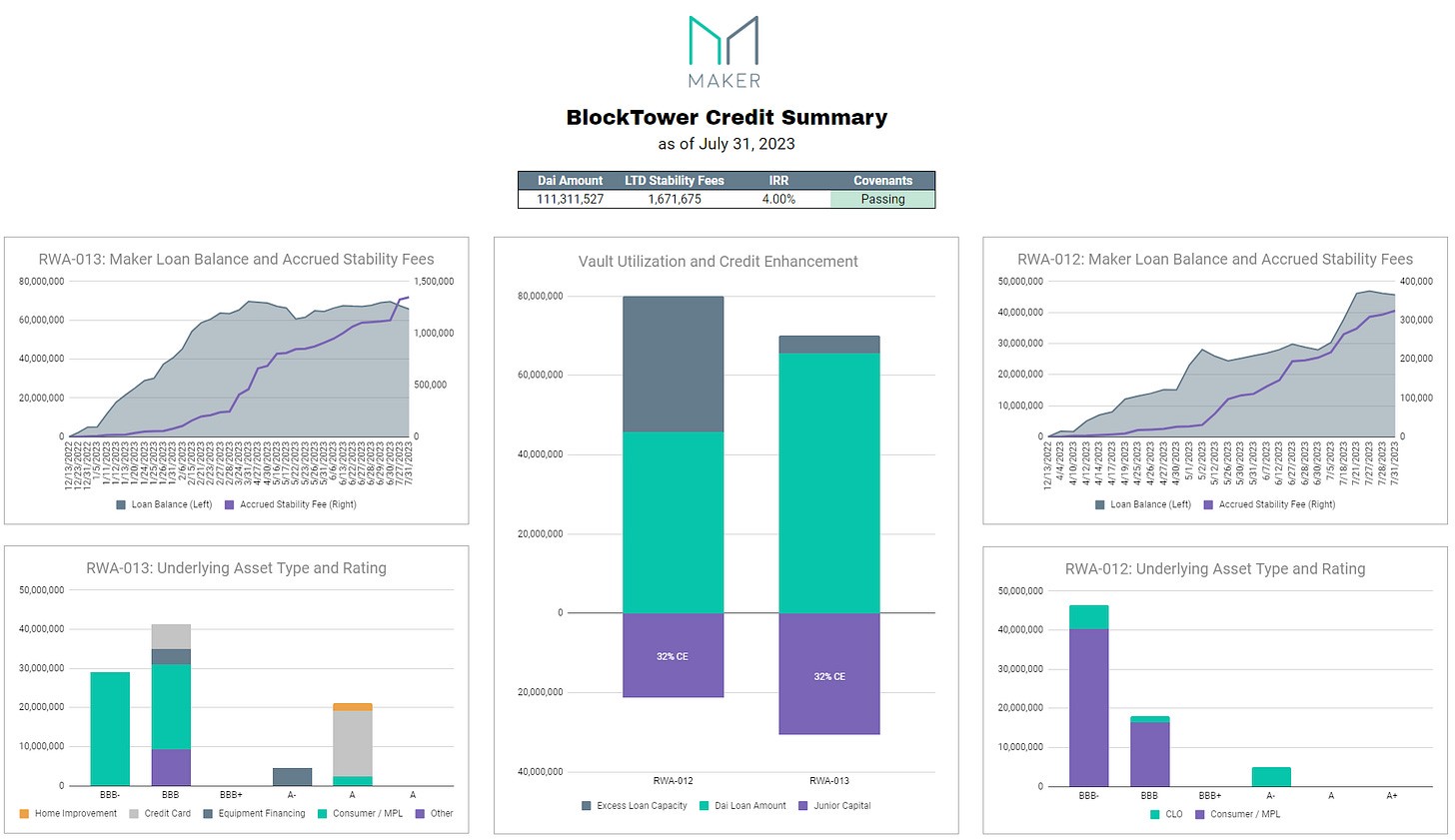 As of the July 2023 RWA report by Steakhouse, the BlockTower Credit vaults have been passing all performance criteria required by MakerDAO, although the debt it manages does pose a significantly higher risk of default than the previously mentioned RWA vaults and requires regular monitoring of assets in the pool.