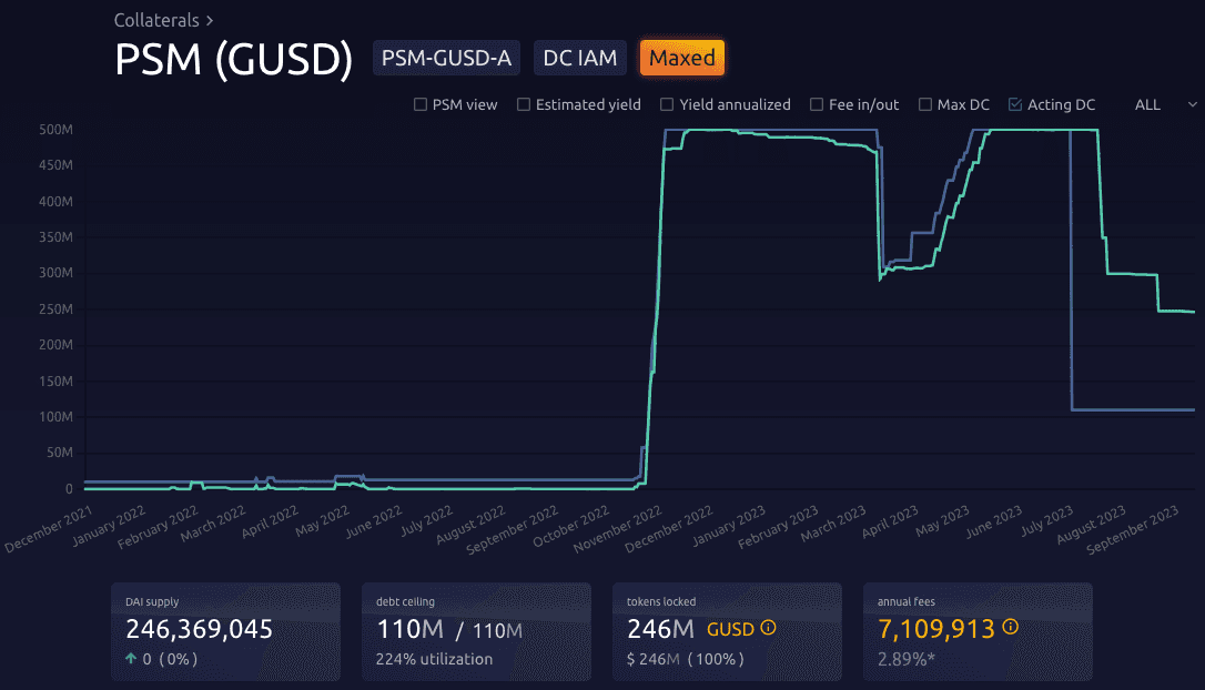 Another significant portion of MakerDAO’s stablecoin holdings was previously composed of Gemini’s GUSD in the PSM-GUSD-A (see LlamaRisk’s GUSD report here). In June 2023, MakerDAO passed a vote to lower the GUSD debt ceiling from 500 million DAI to 110 million DAI due to its lack of liquidity and lower yield compared to USDC held at Coinbase Custody. The chart below shows the amount of GUSD in the PSM (aqua) vs. the DAI debt ceiling set by MakerDAO governance (blue):