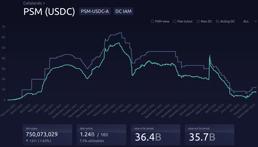 The USDC depeg event of March 2023 was also followed by a rapid outflow of USDC from the PSM, further expediting the transition from stablecoin to RWA backing.