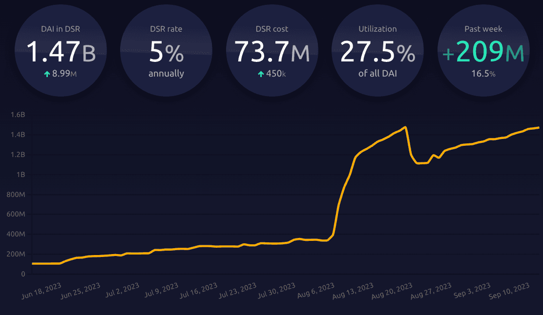 The Dai Savings Rate (DSR) is a feature within the MakerDAO system that enables DAI holders to accrue interest. By depositing DAI via the summer.fi interface, users can enjoy returns generated by MakerDAO. The current APY for September 2023 stands at 5.00%, a notable rise from its previous rate of 1%.