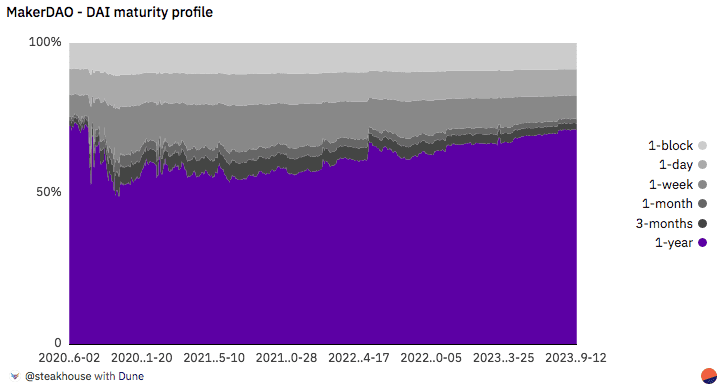 The DAI maturity profile shows an increasing trend towards the 1-year maturity, with its proportion rising to over 70%. This could suggest growing trust and a longer-term outlook within the DAI ecosystem, but it is also tied to the interest rate environment. Meanwhile, despite their fluctuations, short-term maturities have maintained a substantial presence. This underscores the importance for Maker to maintain a liquid portfolio amid changing markets.