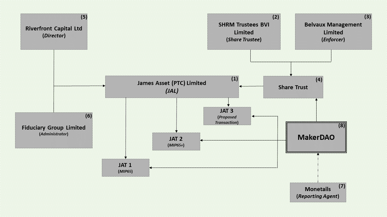 A legal assessment explains the BVI private trust company James Asset (PCT) Limited (JAL) represents MakerDAO as the trustee, the same trustee as for the Clydesdale vault outlined in MIP65. SHRM Trustees (BVI) Limited holds the shares to the trust and is monitored by Belvaux Management Limited to ensure the Share Trustee is properly administering the Trust. Riverfront Capital Ltd is the sole director of the Trust with Fiduciary Group Limited acting as Administrator to ensure the actions of JAL are in accordance with the MakerDAO resolution. It should be noted that assets from JAT 1 and 2 have been commingled into one Clydesdale vault, consolidating two original vaults while preserving their legal structures. Monetalis provides reporting services to MakerDAO on its forum, such as in this post from August.