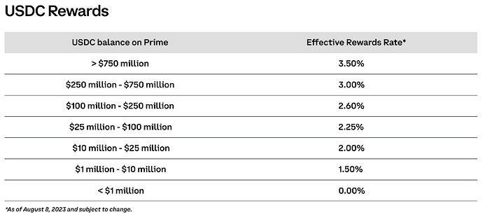 The vault became active in May 2023 and is at full capacity, having maintained its 500M DAI debt ceiling. Since August 2023, the reward rate offered by Coinbase has been increased to a maximum of 3.5% for balances > $750m: