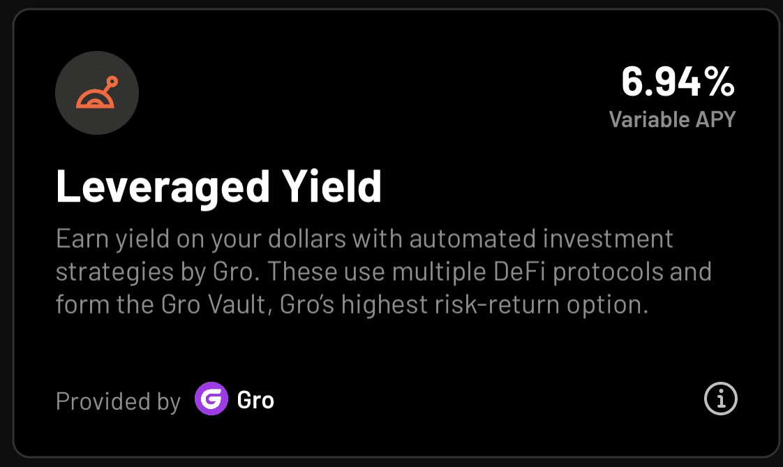Gro Protocol offers yield on a user’s stablecoins via their Powered Savings product (PWRD; also the stablecoin in question) and leveraged yield product (Gro Vault Token).
