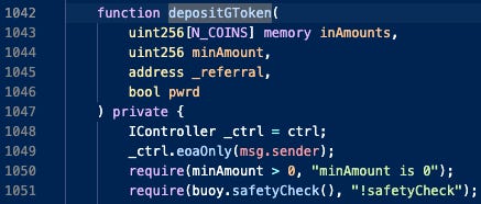 The depositGToken method in DepositHandler.sol contract is called for depositing into PWRD and GVT strategies. These are disabled if Buoy3Pool.sol contract returns a False safety check.