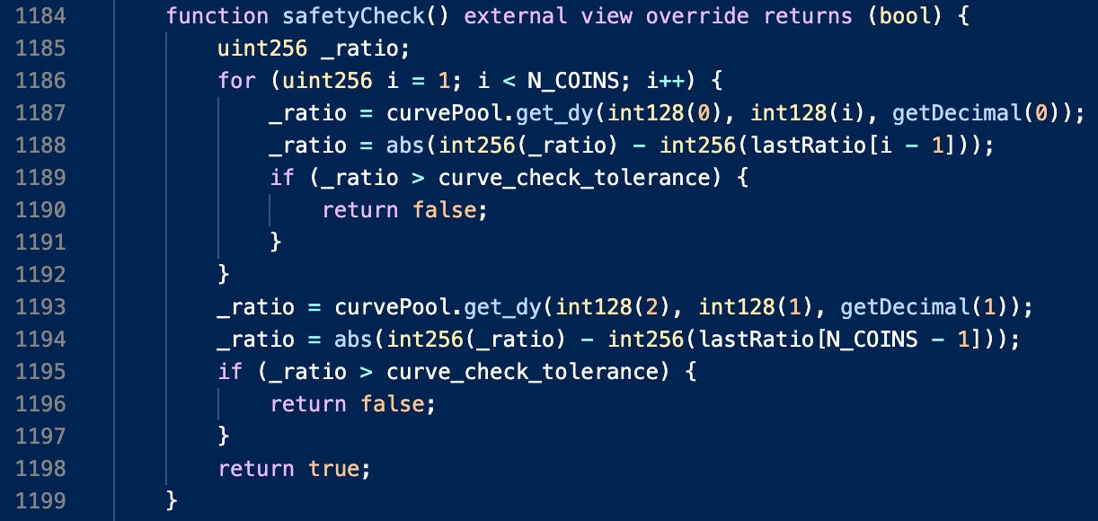 These sanity checks are performed each time a user deposits or withdraws liquidity to and from the protocol. Should the safetyCheck fail, the protocol disables withdrawals (in their WithdrawHandler.sol contract):