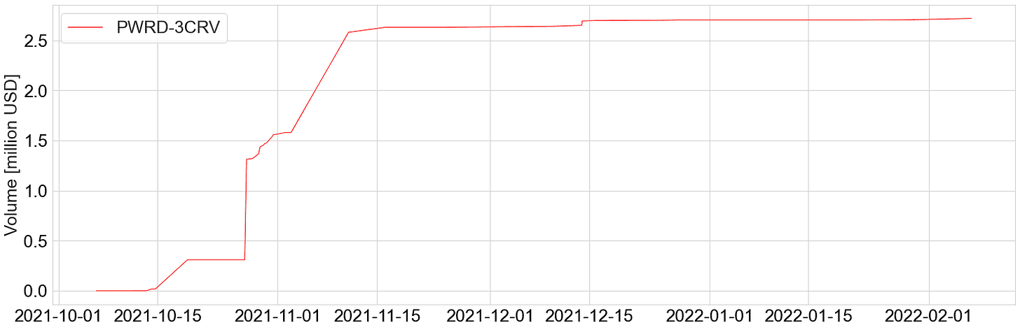 The cumulative volume on Curve is approximately 2.5 million USD, bringing in approximately 750 USD in fees. This is a low amount of value being returned to veCRV holders for directing CRV inflation to the PWRD-3CRV gauge.