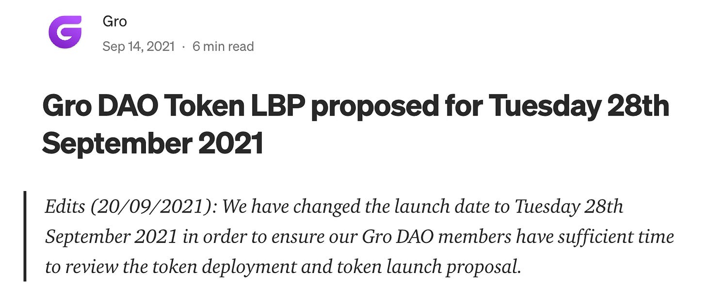 The GRO DAO Token liquidity bootstrapping event (LBP): Medium article.