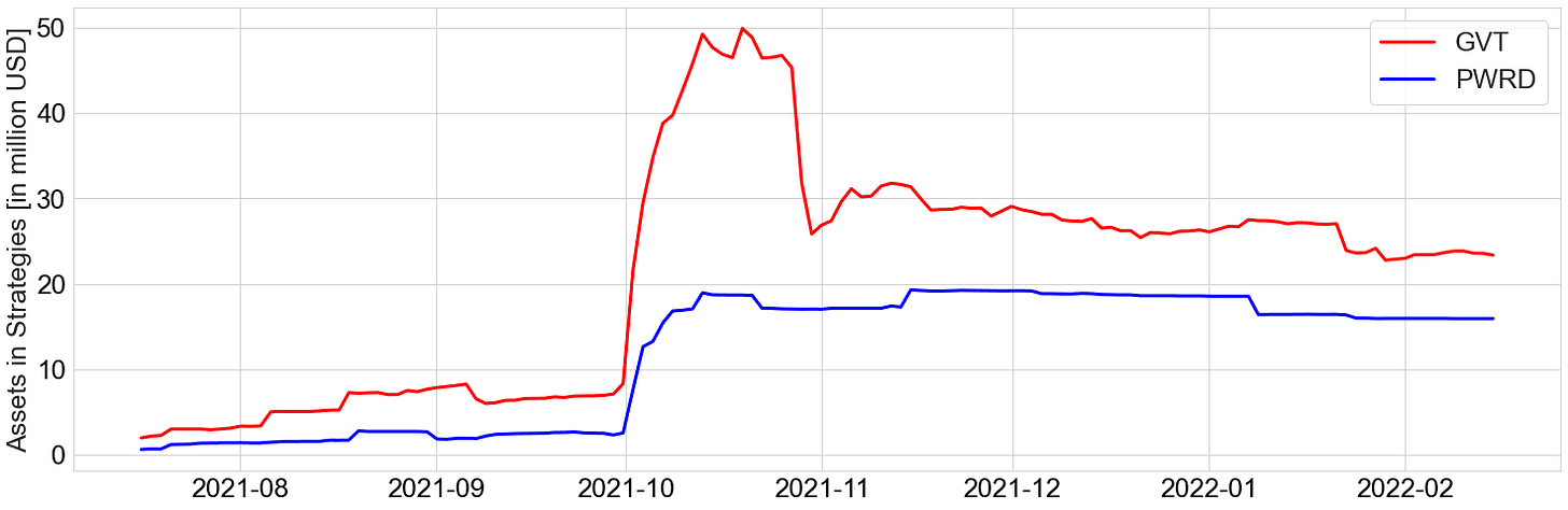 This is likely due to the decrease in assets that are within the leveraged yield strategies primarily in the end of October 2021, whereas assets in PWRD have remained stable over time.