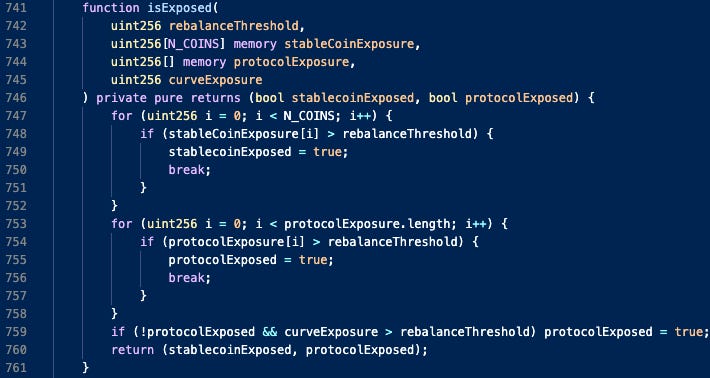 The LifeGuard3Pool.sol contract is used to rebalance strategies into more favorable allocation ratios. The decision to rebalance is dictated by the protocol’s definition of risk, governed by a rebalanceThreshold parameter. This is achieved in the isExposed method in Exposure.sol: