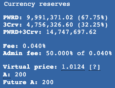 Currently, most of PWRD liquidity has about 14.74 million USD in its Curve Factory 44 metapool. The pool’s inception was on the 28th of September 2021, and has observed significant price deviations from its peg. It currently has a lopsided distribution, and a pool amplification factor of 200: this might be too high, considering PWRD’s historical price instability. Something in the order of A = 100 might be safer for PWRD, affording arbitrageurs a higher re-pegging velocity.