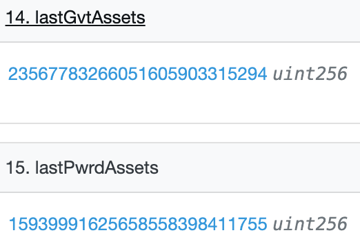 The collateralisation ratio of PWRD can be obtained by taking the ratio of lastGVTAssets and lastPwrdAssets. Image derived from Etherscan.