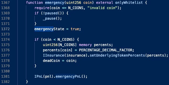 Within the emergency state, the protocol stops interacting with Curve entirely, as 3pool could then be arbed into a full depeg.