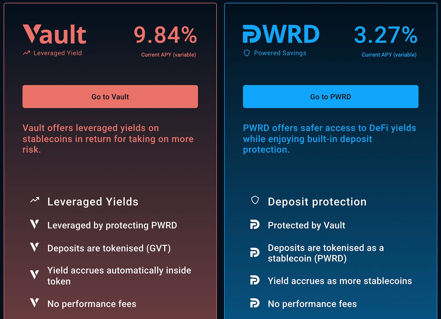 PWRD is composed of DAI, USDC and USDT, and is insured by GVT liquidity providers: risk is transferred to GVT for lower yields (but lower risk as well).