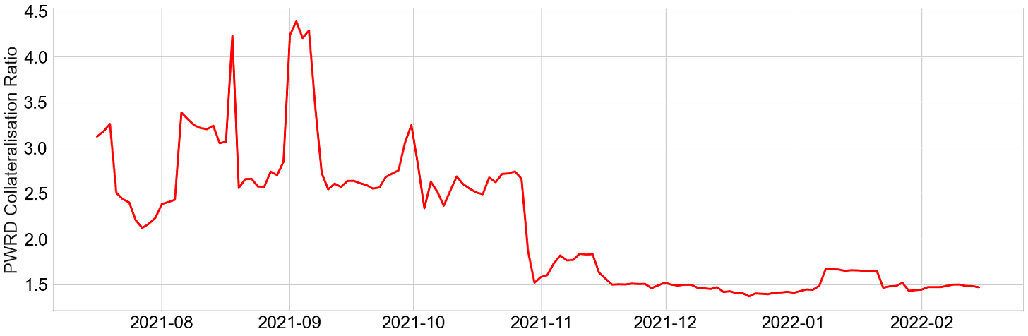 Collateralisation ratio of PWRD. This is derived from the ratio between assets in GVT strategies (the insurance) and assets in PWRD strategies (the insured).