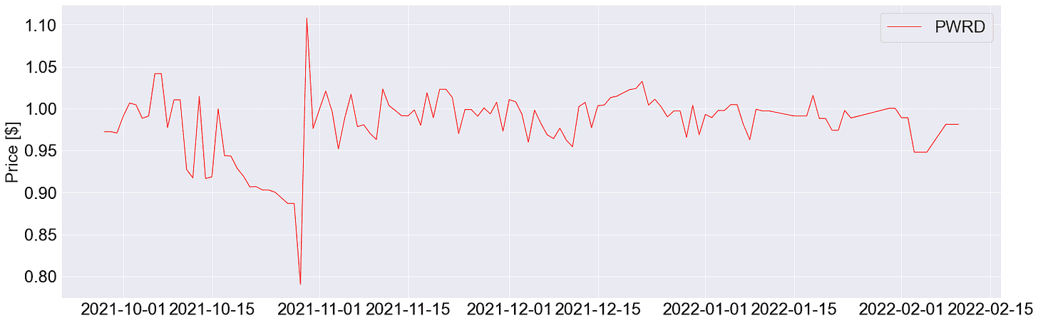 Historic price stability of PWRD. Data derived from CoinGecko.